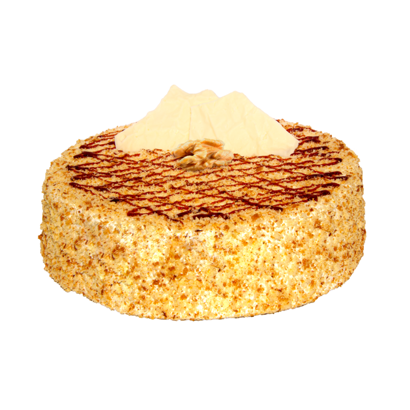 Медовые коржи, взбитые сливки, сметана и вишня.