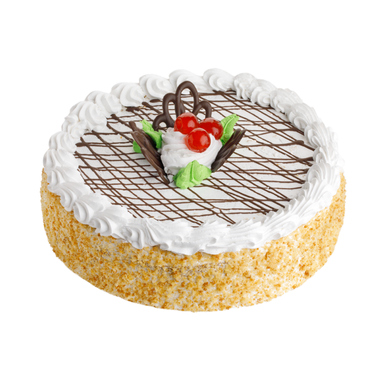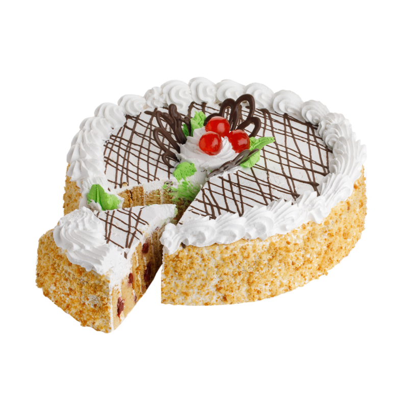 Медовые коржи, взбитые сливки, сметана и вишня.